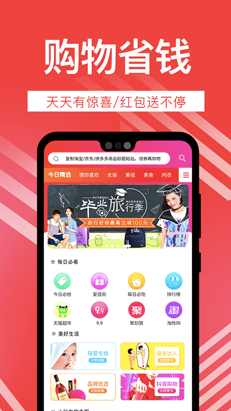 手机淘券猫优惠券app,购物省钱,天天有惊喜,红包送不停;当季新品特卖,大牌精选,天天特价;疯抢排行榜,超高性价比,省钱更实用;抢优惠券,天天更新,优惠多多。