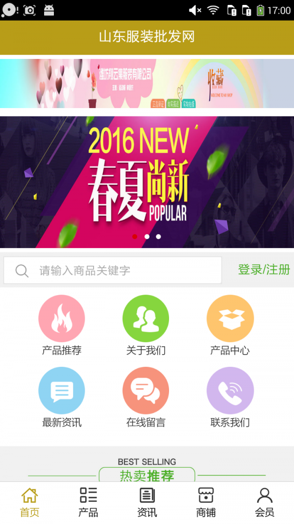 山东服装批发网客户端不仅具备购物、查询订单、搜索商品、行业资讯和产品评价等常用功能,而且还实现了手机版特有的会员注册登录、广告位、招商开店等功能。目标是整合当地品牌商、生产商、经销商,为商家和消费者之间提供一站式解决案。