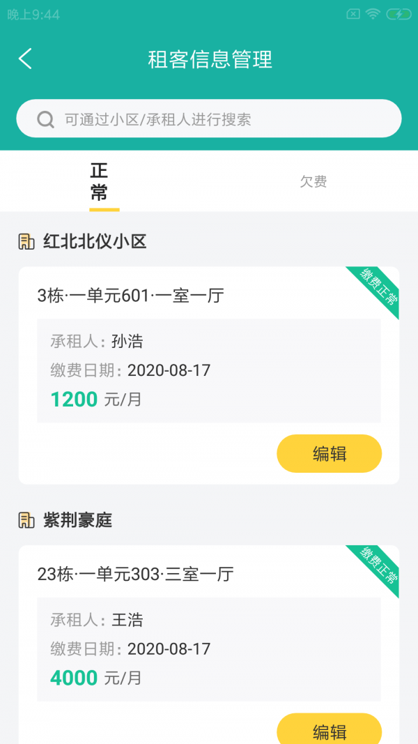 7.租户档案:维护租户基本信息,支持上传身份证图片,拨号,发送短信.