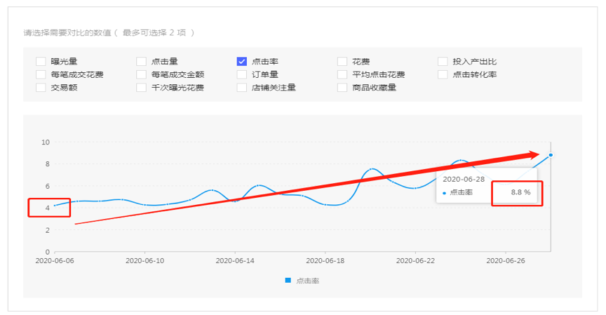 2.点击率:是衡量商品是否受到用户欢迎的重要指标,拥有高点击率的商品,系统才可能认为这是受欢迎的产品,后期才有可能给予更多的曝光机会!点击率优化的方向主要从创意图片,促销文案, 精准关键词 ,精准人群等几个方面入手,没有最高,只有更高!(下图中优化前4%左右,优化后8.8%)