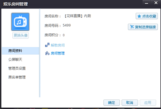 在弹出的房间信息面板中的房间资料页面,可看到房间名称栏,管理员可直接鼠标点击名称并输入新的房间名称,此处名称最大长度为48个英文字符,16个中文字符。
