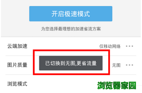 进入极速省流页面之后,点击“图片质量”选项,然后将图片质量设置为“无图”。