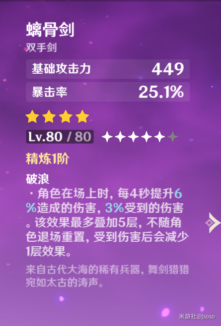 大月卡推荐螭骨剑,具体属性如图所示,副属性带来的暴击可以少刷很多圣遗物副属性,主属性ok即可。