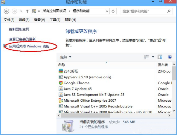 在卸载或更改程序窗口中继续点击启用或关闭windows功能的选项。