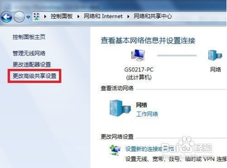 首先使用鼠标点击windows7 64位桌面任务栏中的网络图标,打开网络和共享中心,然后点击左侧列表里的更改高级共享设置。