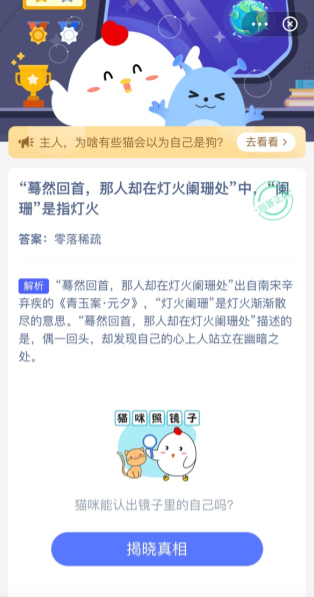 以上就是西西小编为大家带来的蓦然回首那人却在灯火阑珊处中阑珊是指灯火,蚂蚁庄园今日答案。希望大家喜欢。