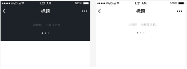 小程序导航栏支持基本的背景颜色自定义功能,选择的颜色需要在满足可用性前提下,和谐搭配微信提供的两套主导航栏图标。建议参考以下选色效果: