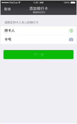 例如下图中,在添加银行卡时,采用摄像头识别接口来帮助用户输入。除此之外微信团队还对外开放例如地理位置接口等多种微信小程序接口 ,充分利用这些接口将大大提高用户输入的效率和准确性,进而优化体验。