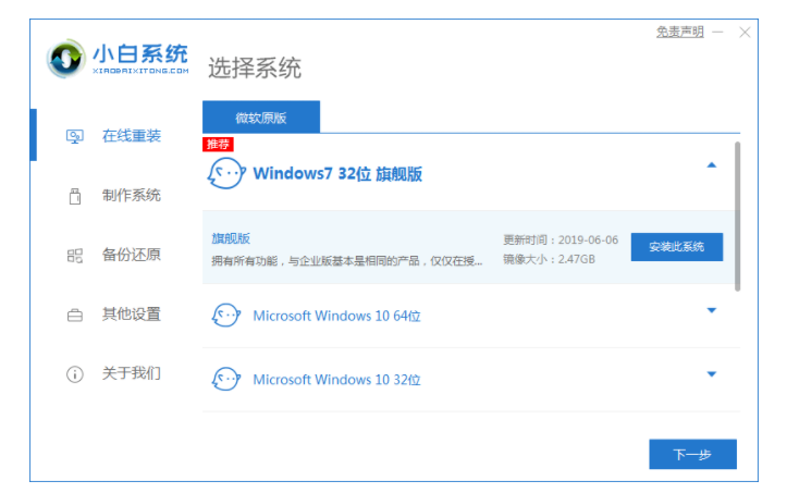 1、下载并安装下载小白一键重装系统软件,选择系统,点击【下一步】。