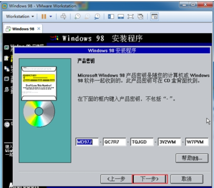 16.再次点击 ;开启此虚拟机; 安装Win98 继续中ing 耐心等待。点击 ;确定; --> 自定义输入 ;红框内容; 后点击 ;关闭。