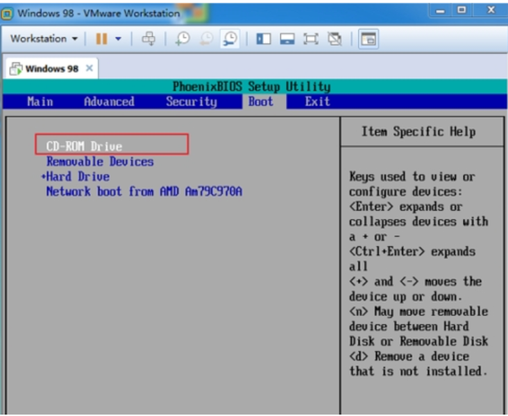 7.点击 ;开启此虚拟机; 开机状态马上 鼠标点击虚拟机内部,按F2。进入 ;BIOS 设置; --> (方向键→) 选择 ;Boot; --> (方向键↑) 选择 ;CD-ROM Driver (键盘 ;+;加好 移至最上方!) --> 按键 ;F10; 保存退出。