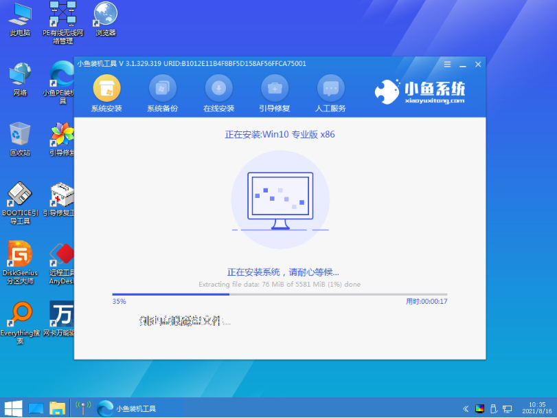 4、插入启动盘进联想电脑中,开机不断按启动热键进启动界面,选择u盘启动项进入到pe系统。打开pe桌面的小鱼装机工具,选择需要的系统点击安装到c盘。