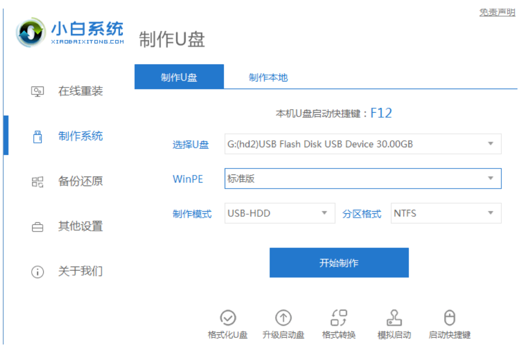 1、先在一台可用的电脑上下载安装小白一键重装系统工具并打开,插入一个8g以上的空白u盘,选择开始制作。