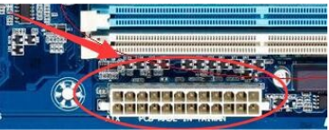 3,主板中,找到24针电源接口,将电源线插入主板中,注意电源线的卡口位置。