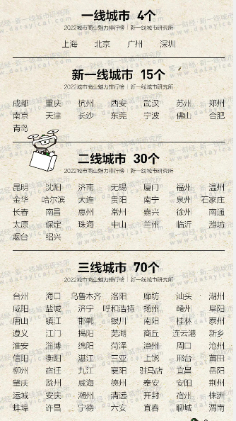 2022新一线城市名单在构成城市的各项要素中,商业活动是城市之所以建立和繁荣的根基。物物交换让城市有了最初的形态,通过交易和流通,人与人之间开始发生系统性的交往,社会分工也随着交换的扩大而出现,城市里诞生了专业从事销售与贸易的商户、物流和仓库,城市运转的基础逻辑也建立了起来。