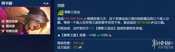 真实伤害羁绊不仅能无视敌方弈子的抗性,造成额外的真实伤害,关键是还会给携带了装备的真实伤害弈子一个闪亮加成,最关键的是阿卡丽的闪亮加成让其技能有20%的吸血,大幅度增加了阿卡丽的续航能力,在面对一些抗性较高的弈子或阵容有着天然的优势。