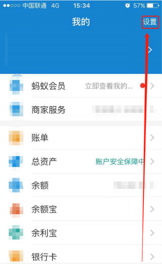 打开支付宝后,点击右下角【我的】,然后点击右上角的【设置】文字按钮,进入设置界面